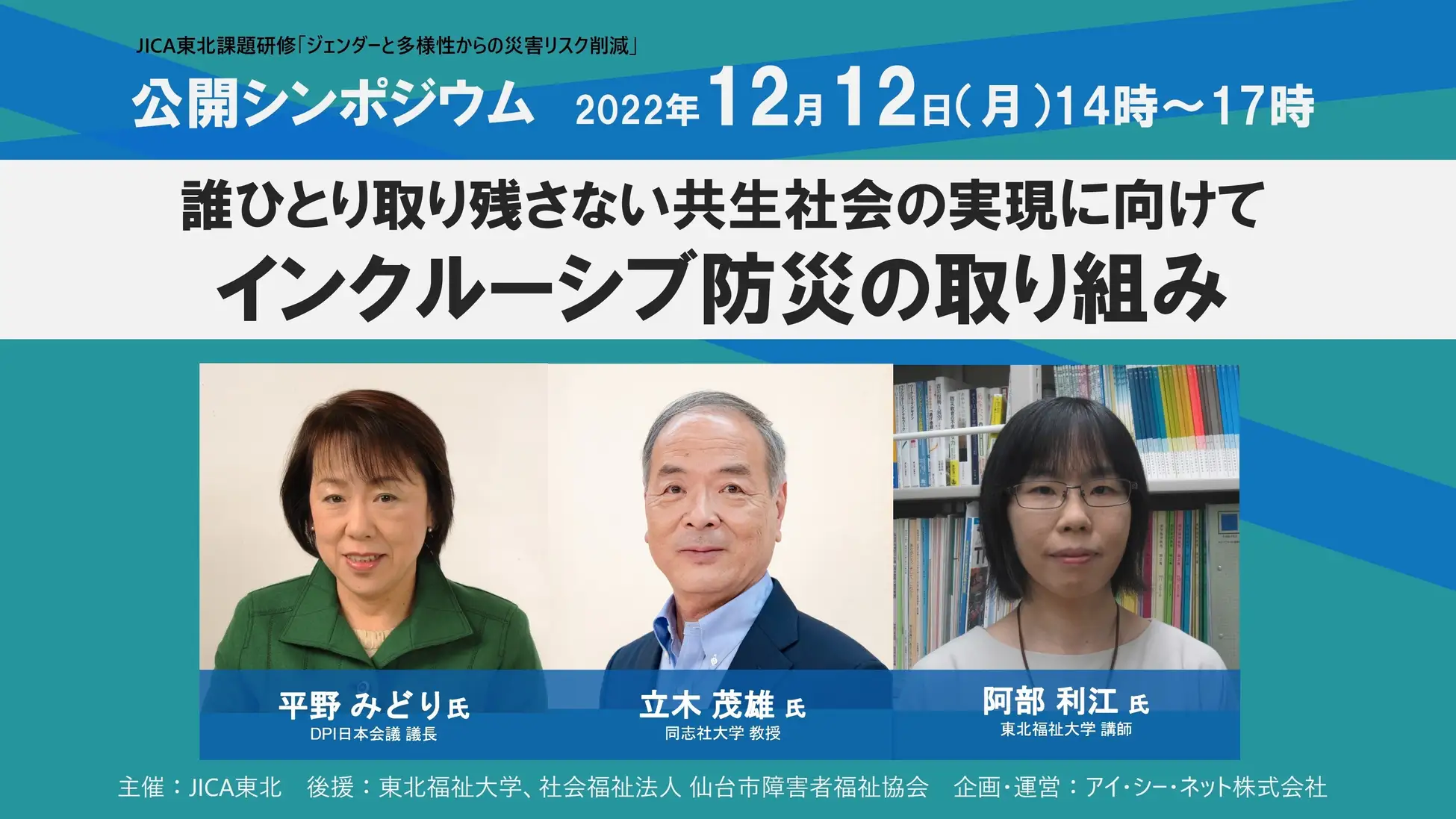 株式会社 学研ホールディングス(東京・品川/代表取締役社長:宮原博昭)のグループ会社、アイ・シー・ネット株式会社(埼玉/代表取締役社長:百田顕児)は、12月12日(月)にJICA東北主催で行うシンポジウムの企画・運営を担当。誰ひとり取り残さない共生社会に向けたインクルーシブ防災について、国内外の有識者と共に考えます。