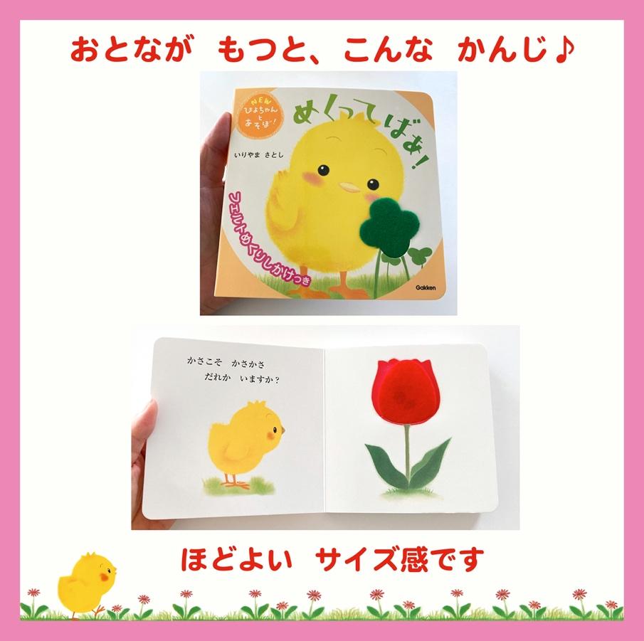 写真のような14センチ×14センチという小ぶりサイズは、ママバッグにもすっぽり入り、軽くて便利。ママやパパにも、小さいお子さまにも持ちやすいサイズと好評です。また、ページが厚い合紙絵本&めくり部分はフェルト製なので、壊れにくく、しかけもページも破れないので、0歳~1歳の赤ちゃんに持たせても安心です。