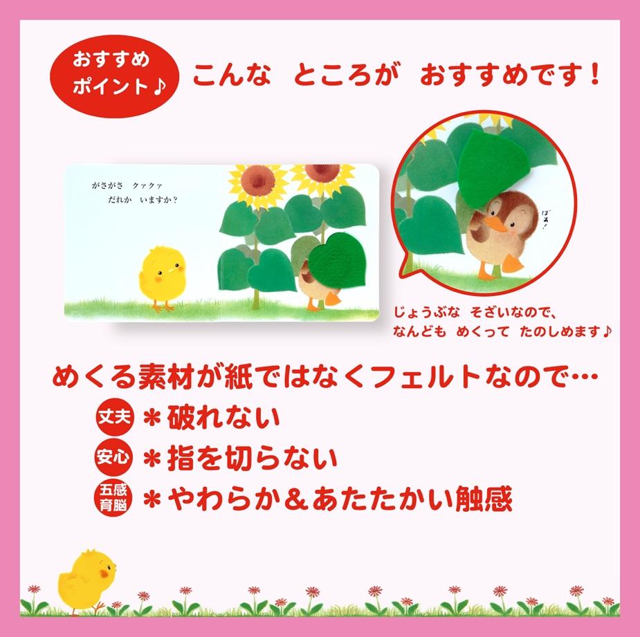 しかけをめくって、かくれていた対象物が現れる「いないいないばあ」遊び。小さいお子さんはこの「いないいないばあ」遊びが大好きです。『めくってばあ!』では、この「いないいないばあ」遊びを取り入れて、発見を楽しむことはもちろんのこと、めくる素材が紙ではなく、フェルトであるのも魅力です。多少乱暴にめくったり、しかけのフェルトを強く引っ張ったりしても破れません。紙と違って指を切らないので赤ちゃんに持たせても安心です。さらに、フェルトの柔らかくて温かい触感がお子さまの五感を育てます。