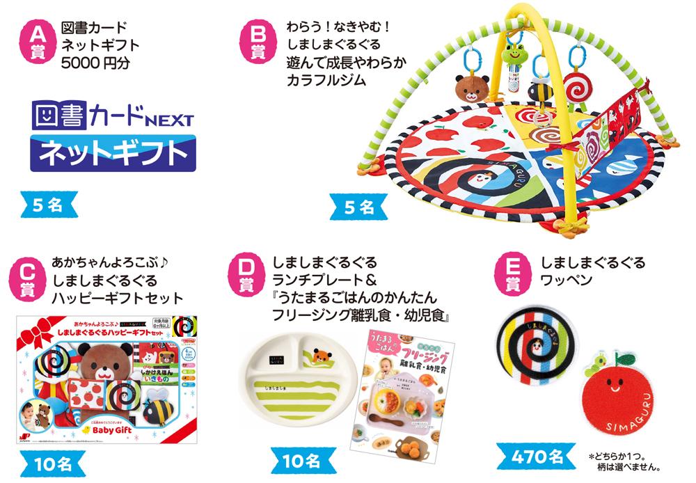 『しましまぐるぐる』をはじめ、赤ちゃん絵本として大人気の「いっしょにあそぼ」シリーズは、この度累計300万部を突破しました。これを記念し、シリーズ対象商品をご購入・ご応募いただいた方を対象に、図書カードネットギフトや『しましまぐるぐる』のグッズなど豪華賞品が500名様に当たるプレゼントキャンペーンを実施いたします。