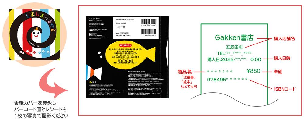 1. 「いっしょにあそぼ」シリーズの対象商品をご購入のうえ、レシート(必須項目の記載があるもの)と商品の写真(バーコード面)を1枚の写真で撮影してください。