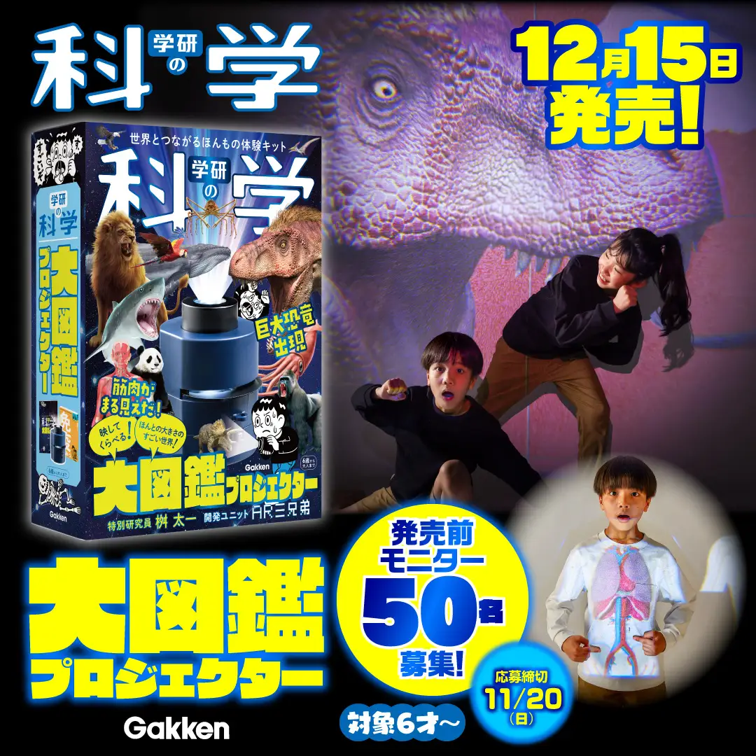 株式会社学研ホールディングス(東京・品川/代表取締役社長:宮原博昭)のグループ会社、株式会社Gakken(東京・品川/代表取締役社長:五郎丸徹)は、2022年12月15日(木)の『学研の科学 大図鑑プロジェクター』の発売に先立ち、先行モニターを50名募集いたします。先行モニターの募集締め切りは11月20日(日)となります。