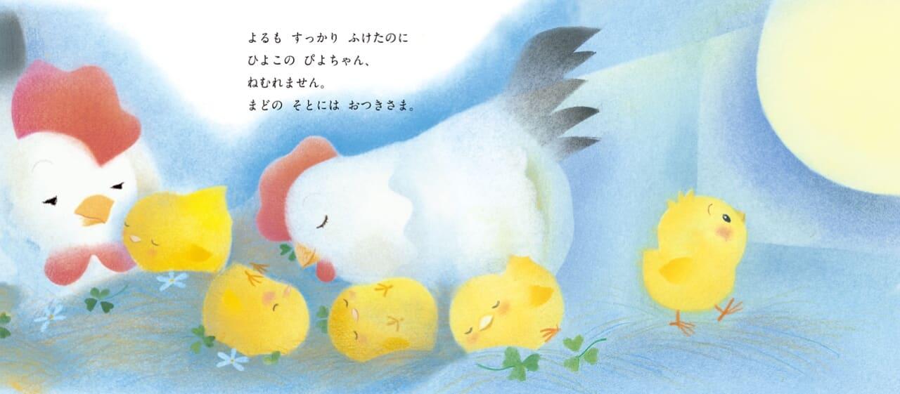 ぴよちゃんのえほんシリーズは、いつもは太陽の日射しいっぱいの明るい昼間の牧場が描かれていますが、『ぴよちゃんの おやすみなさい』では、夜のストーリーが描かれます。いつもとは違う、月の光の射す牧場と夜の森の雰囲気が、ぴよちゃんのえほんシリーズのなかでもちょっぴり異色で、幻想的なストーリーとなっています。