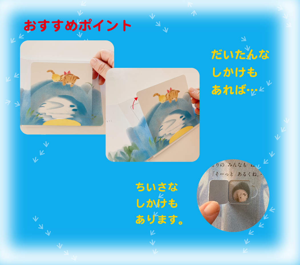 たくさんのしかけが仕込んであります。時間経過や動きを表すおおきなしかけ、裏側にかくれているものを見せる小さなしかけなど、上へ、下へ、右へ…と、めくったり、のぞいたり、臨場感を出すための工夫が仕込まれています。