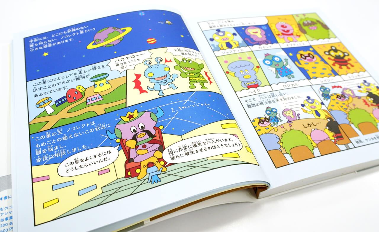問題が提示された後の見開きでは、その宇宙人たちが問題についてあれやこれやと議論をしています。いろいろな性格の人が意見を交わしているのを疑似的に体験でき、“人の立場になって物事を考える力=共感力”を磨くこともできるのです。