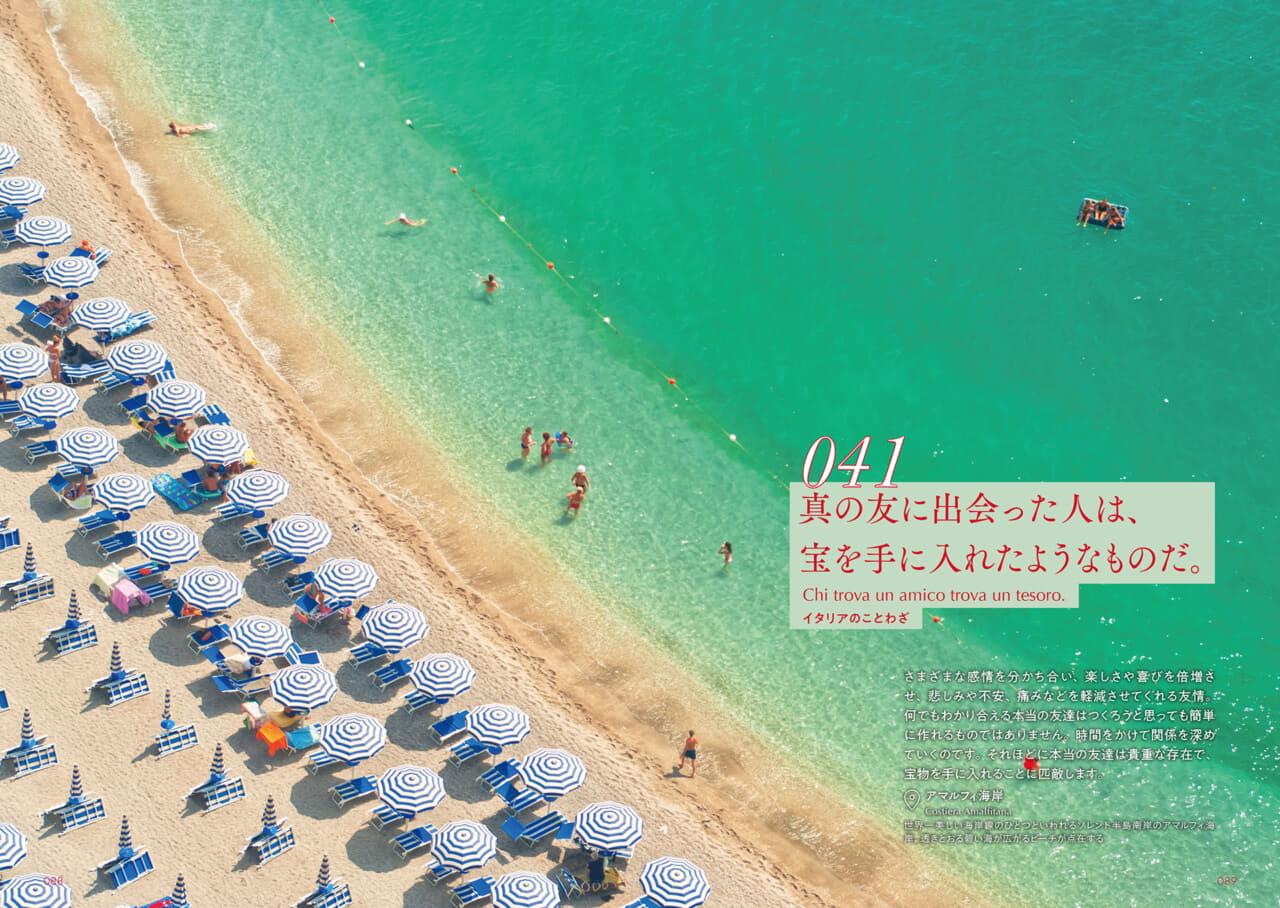 名言とともに紹介する100の写真は、ことばに関する場所や偉人ゆかりの町もあれば、ことばのイメージにぴったりのスポットやモチーフまで実にさまざま。イタリアで絶対に訪れてもらいたい観光名所はもちろん、編集者イチオシの知られざる絶景まで、魅力あふれる土地を掲載しています。各ページには写真の場所紹介や解説もあるので、旅先選びの参考にもおすすめ!