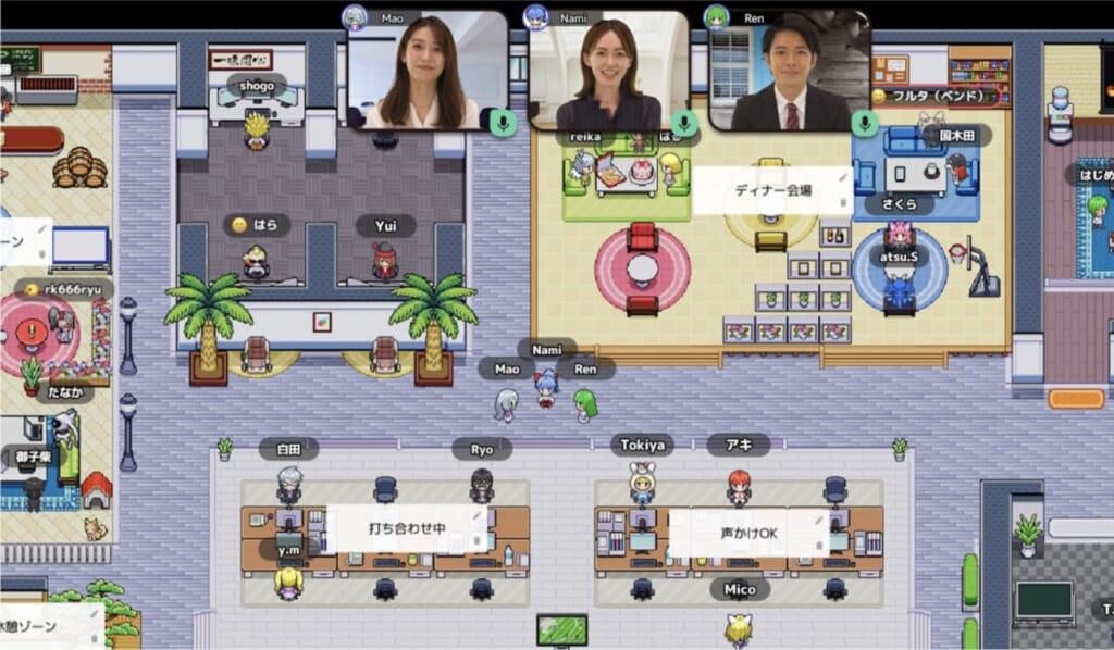 オンライン上の空間に集まることで、実際のオフィスや会場にいるかのような活発なコミュニケーションが可能になります。アバター同士が近づくだけで会話を始めることができるため、オフィシャルな会議だけでなく、ちょっとした雑談にも大変便利です。