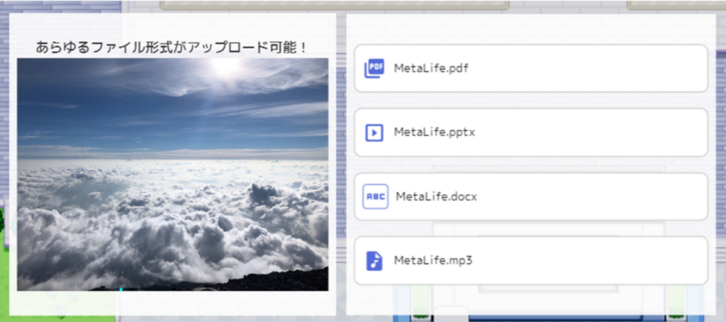 例えば会議中に必要な資料などをMetaLife上に置いておくことで、他のユーザーに簡単に共有することができます。