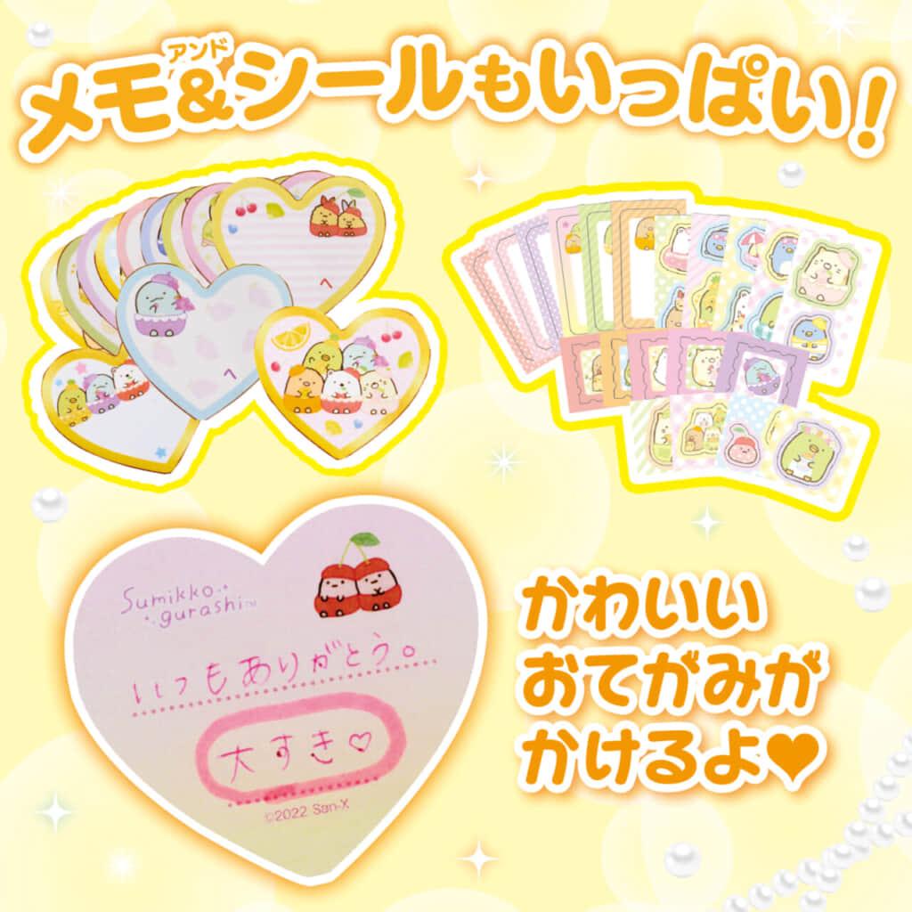 さらに、ハートの形をしたメモや、フルーツを持ったり食べたりしているすみっコたちがかわいいシールもたっぷり。ペンと一緒に使えば、かわいいおてがみがかけること間違いなしです!