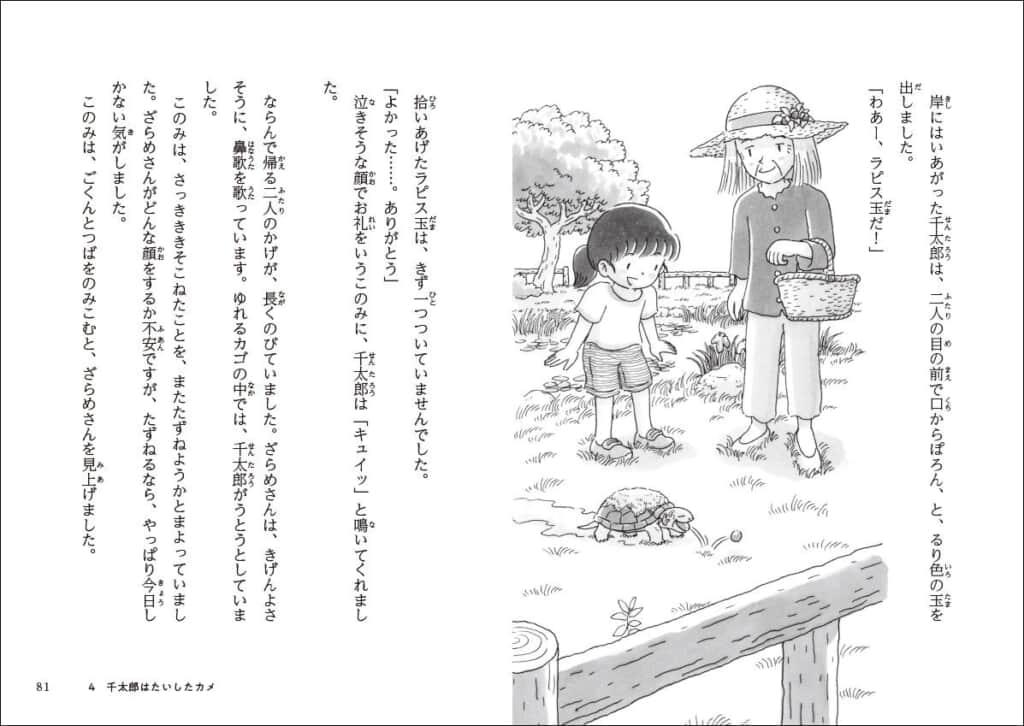 「カステラアパート」の可愛らしい外観や、美しい池の景色、表情豊かな人物・動物たちのイラストで、お話の世界に引き込まれます。