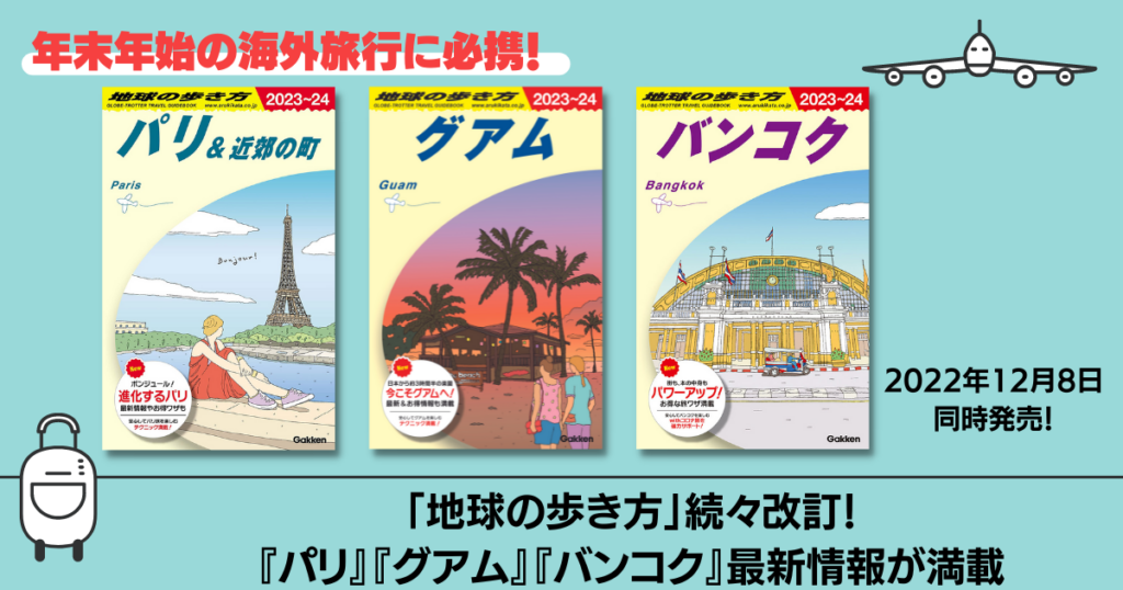 株式会社 学研ホールディングス(東京・品川/代表取締役社長:宮原博昭)のグループ会社、株式会社 地球の歩き方(東京・品川/代表取締役社長:新井邦弘)は、『地球の歩き方 A07 パリ&近郊の町 2023~24』『地球の歩き方 C04 グアム 2023~24』『地球の歩き方 D18 バンコク 2023~24』の3タイトルを2022年12月8日に全国の書店及びオンライン書店で発売いたします。
