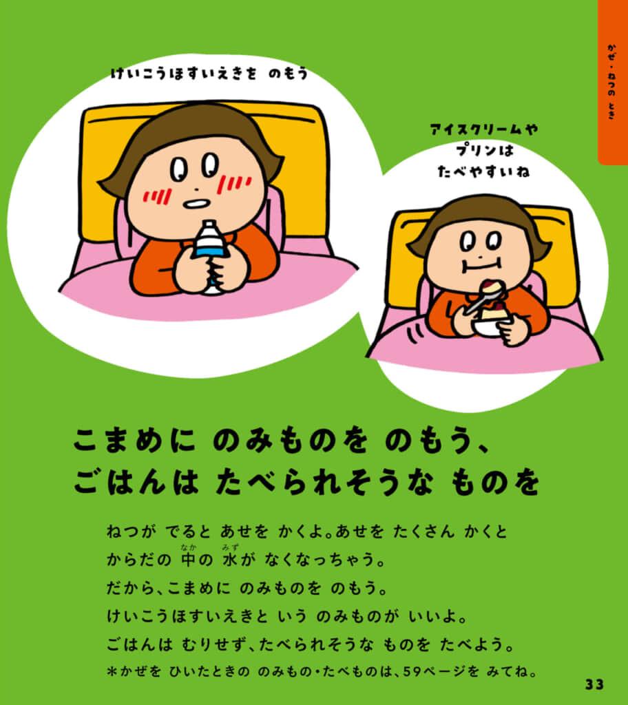 悪化させたり長引かせたりすることなく、早く元気になれるように、子どもたちも自分で意識できるようになるといいですね。また、体の調子がおかしいときは、我慢をしないで、大人に知らせることも紹介しています。