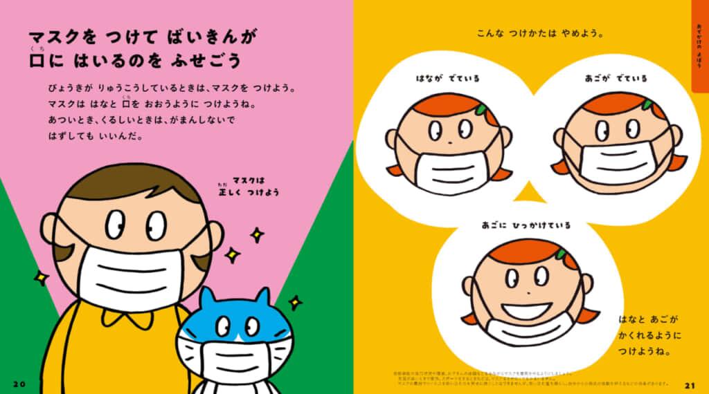 新型コロナ・インフルエンザ・ノロウイルス・マイコプラズマ肺炎・みずぼうそうなど、子どもたちがかかりやすい身近な病気をウイルスのキャラクターのイラストとともに紹介。