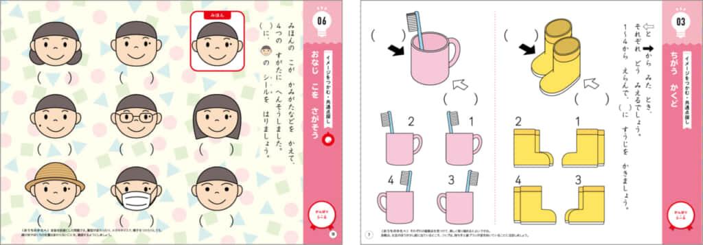 見本の特徴を捉え、ポーズや服装などに違いがある絵をさがす問題や、角度が変わったらどう見えるか想像する問題などを解いて、頭の中でイメージする力をしっかり鍛えます。