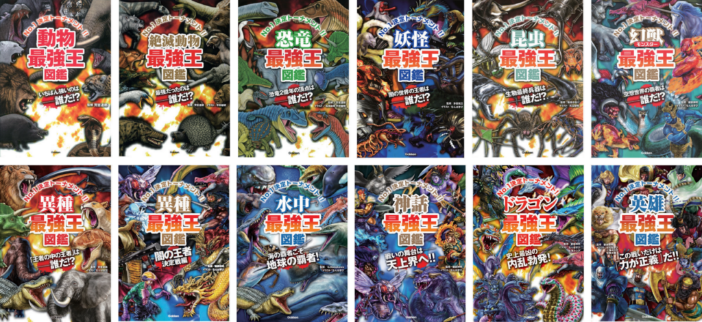 「最強王図鑑」シリーズは、「動物界や恐竜界など、あらゆる種属の猛者たちをトーナメント方式で戦わせ、最強を決めてしまおう」というコンセプトで作られたバトルシミュレーション図鑑。これまでに「動物」「絶滅動物」「恐竜」「妖怪」「昆虫」「幻獣(モンスター)」そして、「水中」「神話」と各界でバトルを繰り広げ、ナンバーワンを決定してきました。戦いは「ドラゴン」にまでおよび、最新刊『英雄最強王図鑑』は発売開始から大好評。