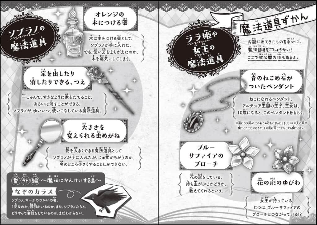登場人物についてくわしくわかるページや、魔法道具やドレスの特集ページで、物語の世界に、よりひきこまれます。