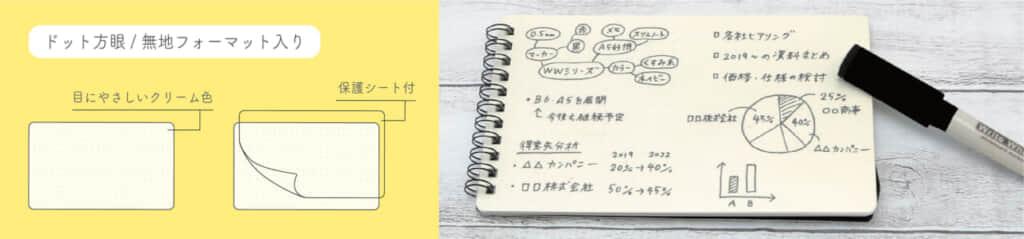 目に優しいクリームベースにドット方眼が印刷されており、文字や図をまっすぐ書くことができます。