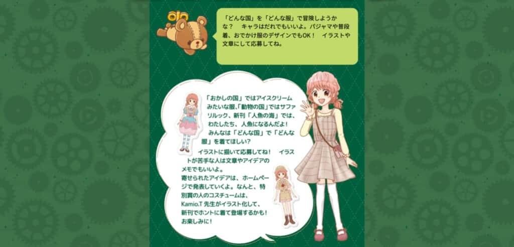 「おかしの国」ではアイスクリームみたいな服、「動物の国」ではサファリルックを着るなど、いろいろな服装を主人公のアンたちはしています。みんなはどんな服装をアンたちに着てほしい? ぜひイラストや文章にしてご応募ください。
