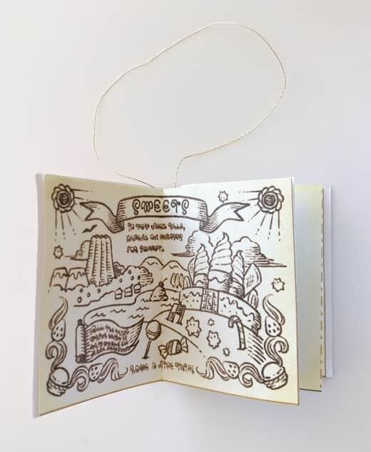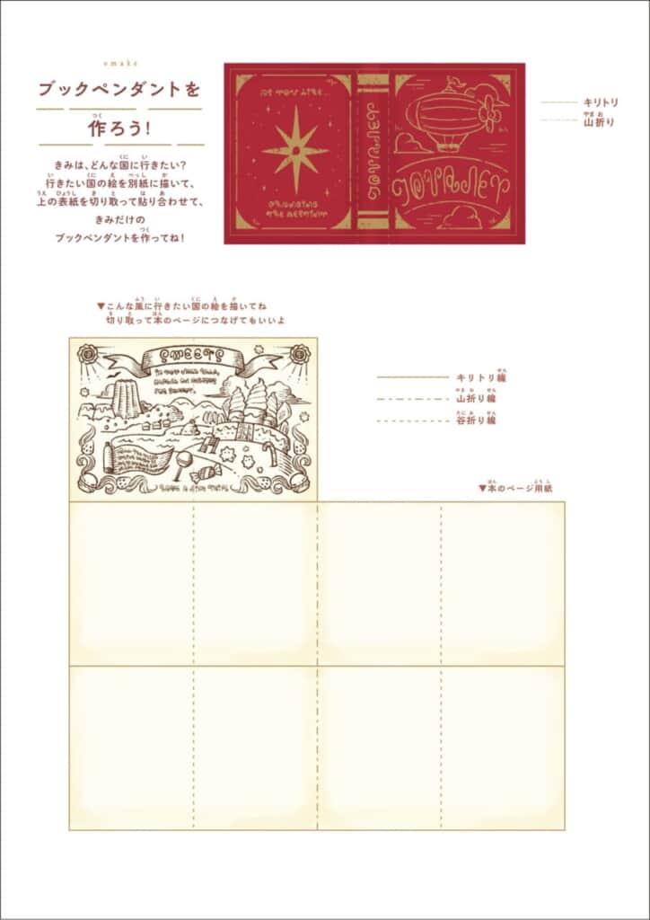 このペンダントブックは物語の中で重要な役割を果たします。トリュフたちがこのブックペンダントに描かれている世界へ旅をすることができるのです。おかしの国、動物の国、人魚の海…、自分ならどこに行きたいかな? 好きな国を描いて自分だけのオリジナルブックペンダントが作れます。行きたい国に思いをはせて、ぜひダウンロードして作ってみてください。作ってから本を読むと、まるで自分もトリュフたちと冒険に出かけるような気分が味わえますよ。