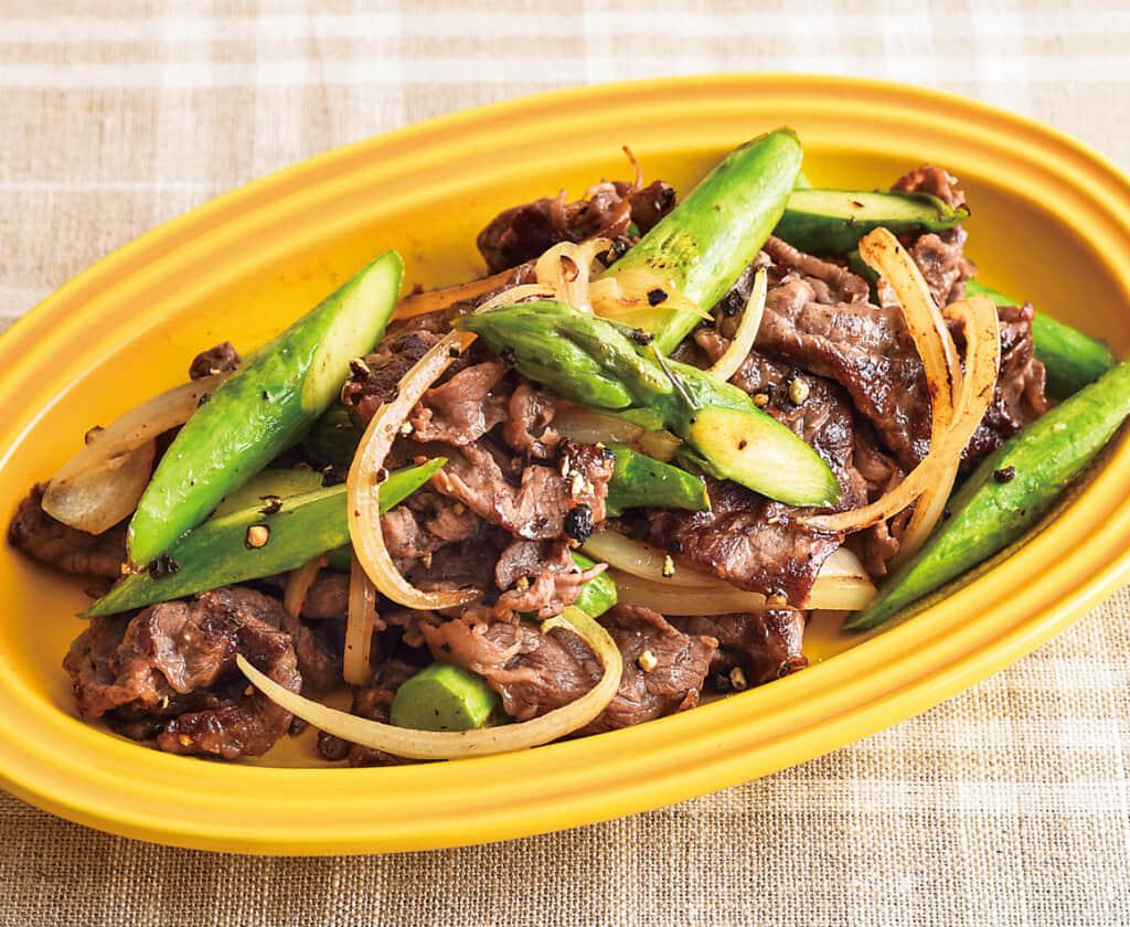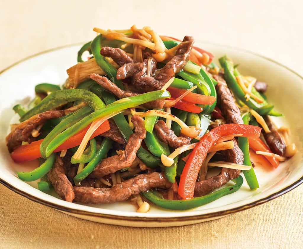 - チンジャオロースーは、食物繊維たっぷりのえのきたけでボリュームアップ