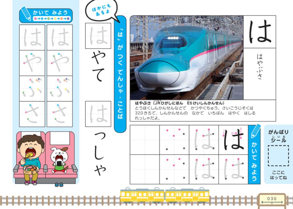 「は」ははやぶさの「は」など、電車に関する言葉を書きます。大好きな電車が出てくるのでお子さんが自分からどんどん進めたくなり、最後まで飽きずに取り組めます。