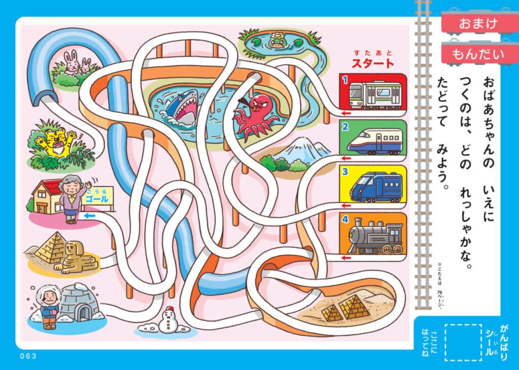 めいろや電車クイズなどのおまけ問題つき。楽しく学べる工夫がいっぱいで、最後まで飽きずに続けられます。