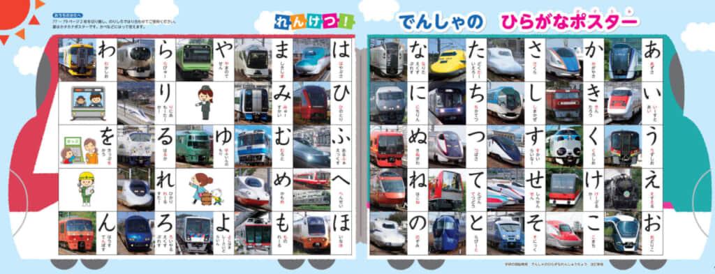 今回の改訂にあたり、電車が一覧できるひらがな・カタカナ表も新たにつきました! 2枚を連結して、横長のワクワクするポスターに。壁などにはっておけば、電車好きのお子さんの目線をいつでもくぎ付け!