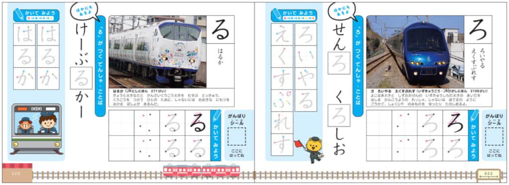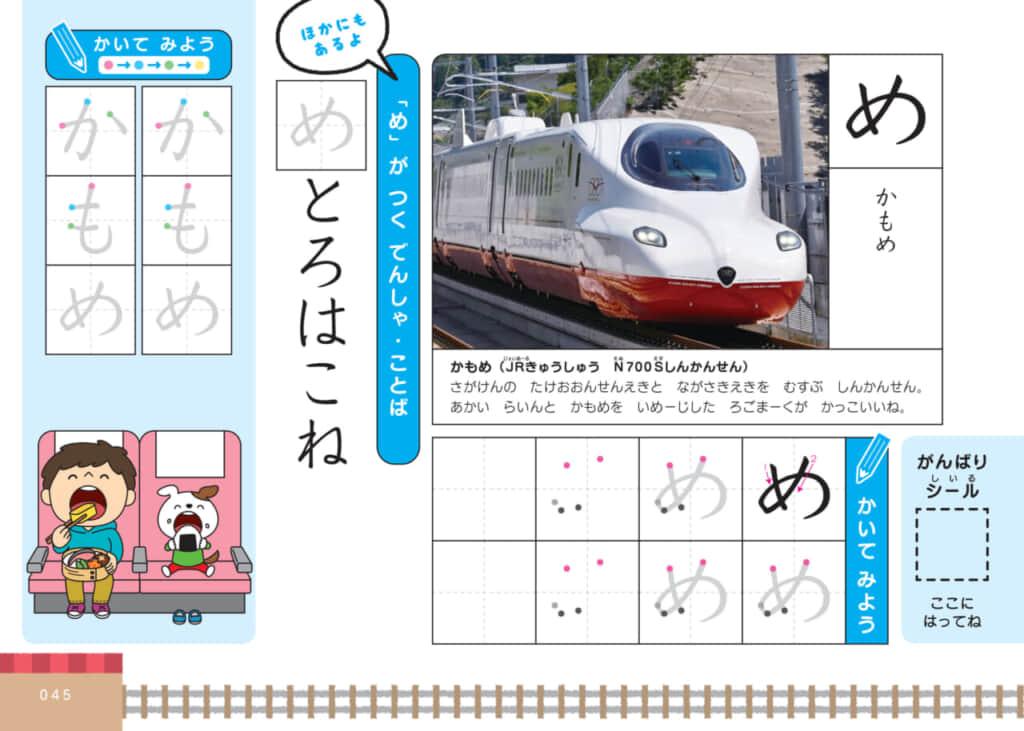 清音の練習ページには、電車などの写真を掲載。説明文を読んで、電車の知識も身につけられます。2022年9月に開業した「西九州新幹線かもめ」をはじめ、「らびゅー(西武鉄道ラビュー)」「おどりこ(サフィール踊り子)」「ひのとり」など新しい電車がたくさん載っているので、電車好きのお子さんも大満足です!