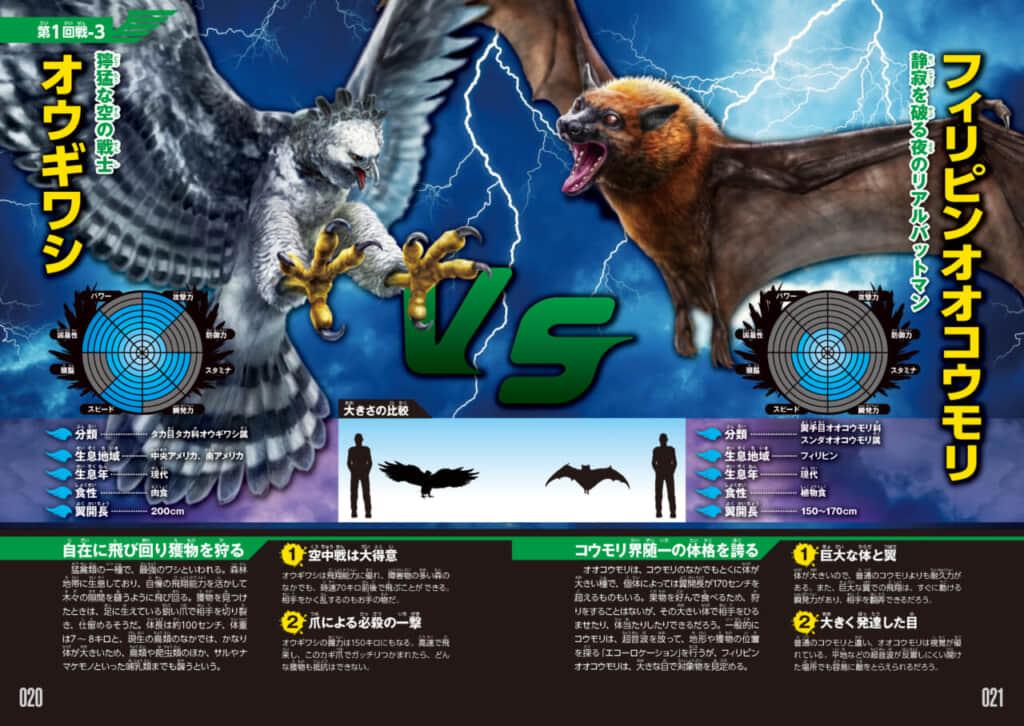 - 「現実世界」の見開き1ページ。大迫力のビジュアルとともに、各「出場者」の解説・能力値のレーダーチャート・全対戦データなどを掲載。