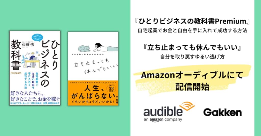 • 【オーディオブック配信開始】ネットで話題! 『ひとりビジネスの教科書 Premium』、『立ち止まっても休んでもいい』がAmazonオーディブルに登場 2023年01月27日 【オーディオブック配信開始】ネットで話題! 『ひとりビジネスの教科書 Premium』、『立ち止まっても休んでもいい』がAmazonオーディブルに登場