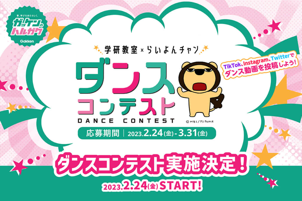 • 『学研教室×らいよんチャン ダンスコンテスト』の開催が決定しました! 2023年01月30日 『学研教室×らいよんチャン ダンスコンテスト』の開催が決定しました!