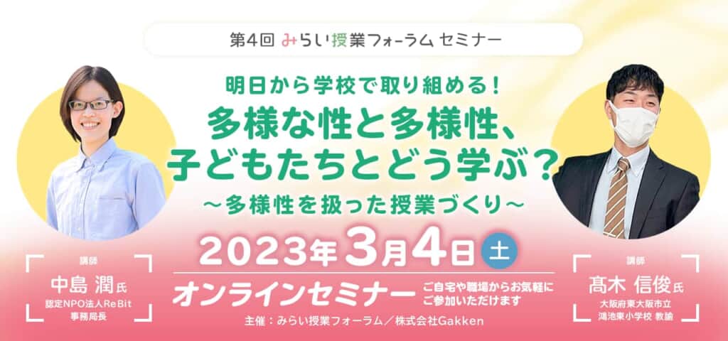 • 多様な性と多様性、子どもたちとどう学ぶ? 第4回みらい授業フォーラムセミナー開催! 2023年01月31日 多様な性と多様性、子どもたちとどう学ぶ? 第4回みらい授業フォーラムセミナー開催!