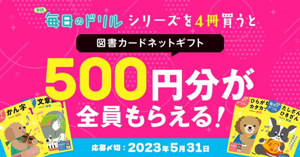 • 小学生の学習習慣づけに最適! 「毎日のドリル」シリーズ4冊購入で、全員に500円分の図書カードネットギフトプレゼントキャンペーン開催! 2023年02月09日 小学生の学習習慣づけに最適! 「毎日のドリル」シリーズ4冊購入で、全員に500円分の図書カードネットギフトプレゼントキャンペーン開催!