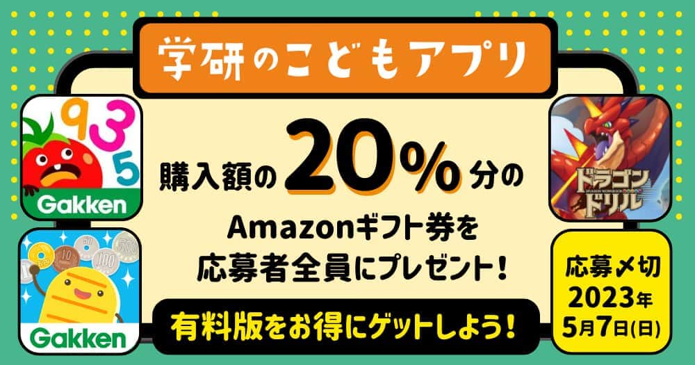 • ガッケンのハルガク2023「こそだてまっぷLINE公式アカウントお友だち追加キャンペーン」毎月20名様に5,000円分のAmazonギフト券が当たる!! (応募最終〆切5/31) 2023年01月06日 ガッケンのハルガク2023「こそだてまっぷLINE公式アカウントお友だち追加キャンペーン」毎月20名様に5,000円分のAmazonギフト券が当たる!! (応募最終〆切5/31)