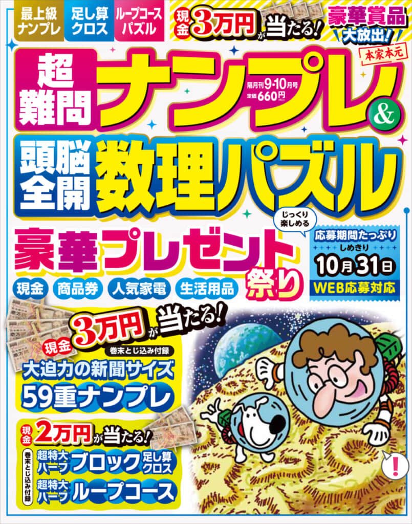 • 【当選者数アップ! 現金・金券や豪華賞品が152名に当たる】手応え抜群の全137問を掲載。数理パズルファン必携の専門誌『超難問ナンプレ&頭脳全開数理パズル』発売 2023年12月06日 【当選者数アップ! 現金・金券や豪華賞品が152名に当たる】手応え抜群の全137問を掲載。数理パズルファン必携の専門誌『超難問ナンプレ&頭脳全開数理パズル』発売