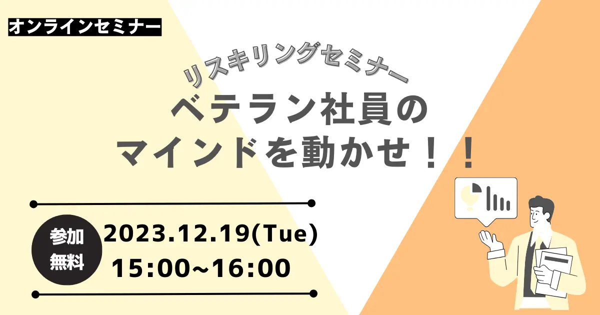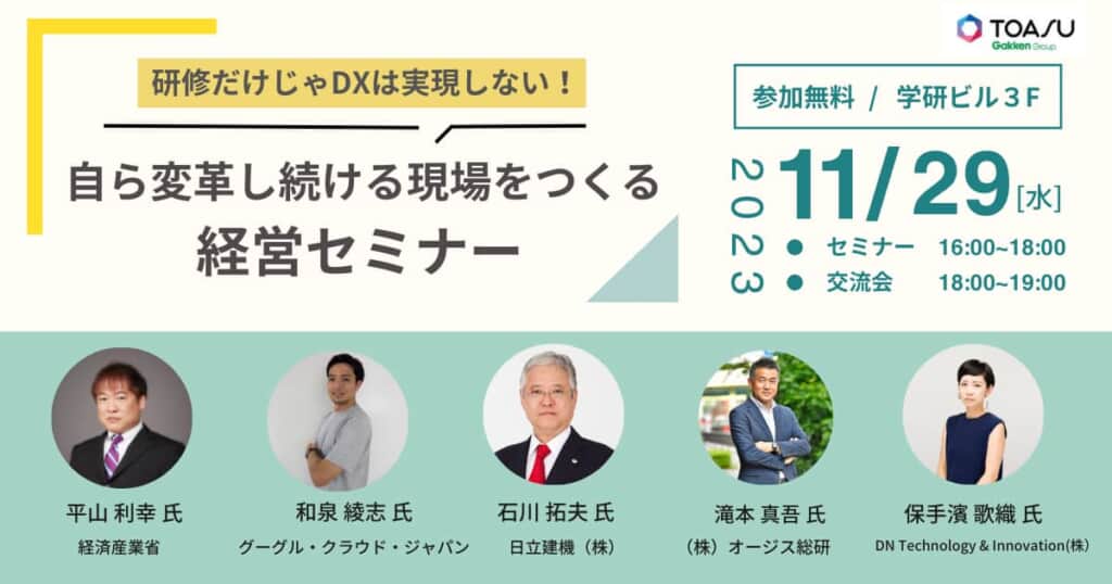 • TOASU、リスキリングに取り組む企業人事担当者を対象に「【リスキリングセミナー】ベテラン社員のマインドを動かせ!!」を開催 2023年12月07日 TOASU、リスキリングに取り組む企業人事担当者を対象に「【リスキリングセミナー】ベテラン社員のマインドを動かせ!!」を開催