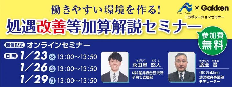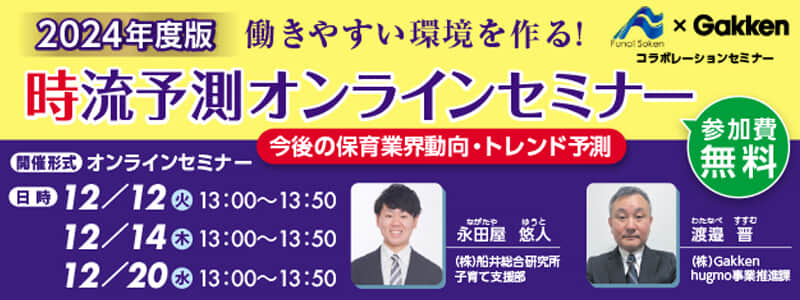 • 【幼稚園・保育所向け】船井総研×Gakken無料オンラインセミナーを開催 2023年12月08日 【幼稚園・保育所向け】船井総研×Gakken無料オンラインセミナーを開催