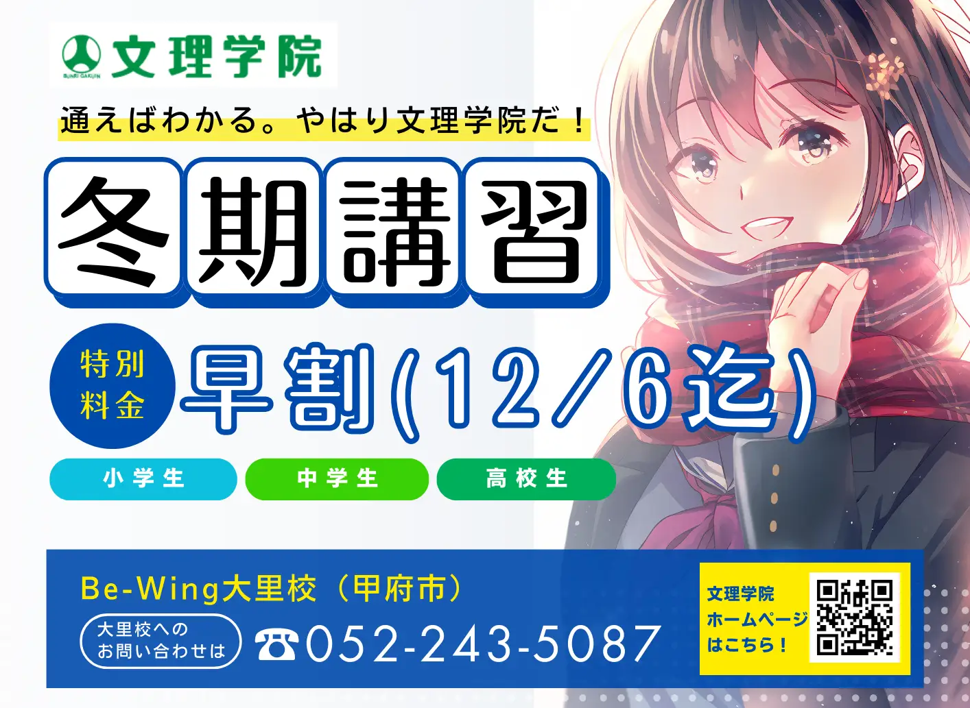 • 【文理学院(山梨・静岡)】大里校(甲府市)がBe-Wing新年度生(中・高生対象)の募集を開始しました! 2023年01月20日 【文理学院(山梨・静岡)】大里校(甲府市)がBe-Wing新年度生(中・高生対象)の募集を開始しました!