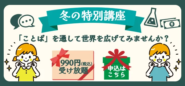 • 冬の特別講座開催!「聞く・話す・読む」力を伸ばすオンライン学習サービス「ことばパーク」が12月23・25日に990円で2日間受講し放題のオンラインイベント「ことばを通して世界を広げよう」を実施します! 2023年12月15日 冬の特別講座開催!「聞く・話す・読む」力を伸ばすオンライン学習サービス「ことばパーク」が12月23・25日に990円で2日間受講し放題のオンラインイベント「ことばを通して世界を広げよう」を実施します!
