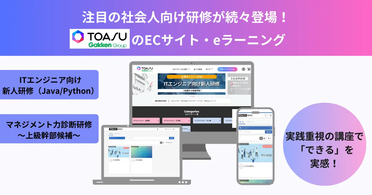 • 【社会人対象】株式会社TOASUが学びのECサイトをオープン。公開研修、eラーニングプラットフォームの提供を開始〉 2023年12月19日 【社会人対象】株式会社TOASUが学びのECサイトをオープン。公開研修、eラーニングプラットフォームの提供を開始〉