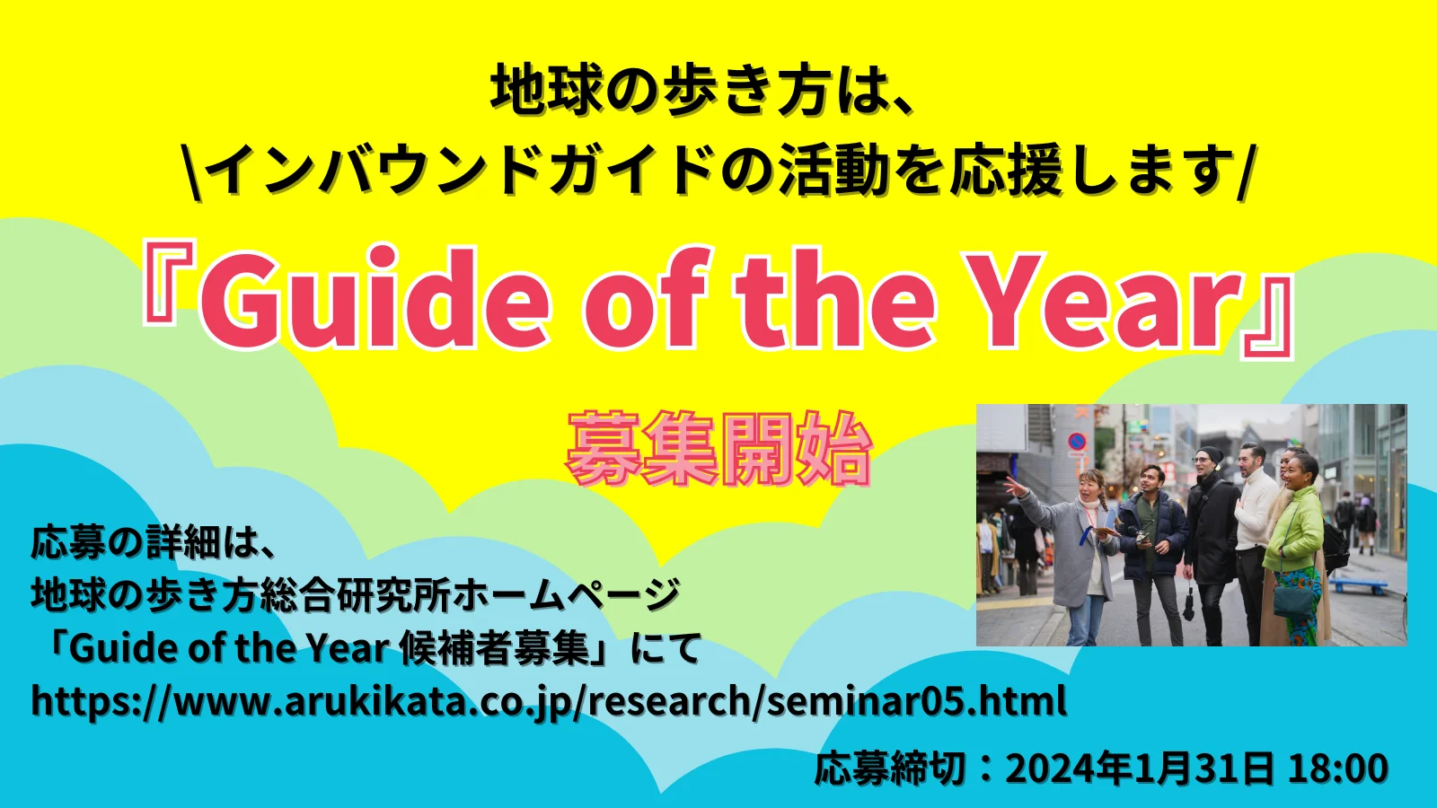 • 【地球の歩き方総合研究所】旅の価値を上げるガイドを表彰する『Guide of the Year』の募集を開始 2023年12月21日 【地球の歩き方総合研究所】旅の価値を上げるガイドを表彰する『Guide of the Year』の募集を開始