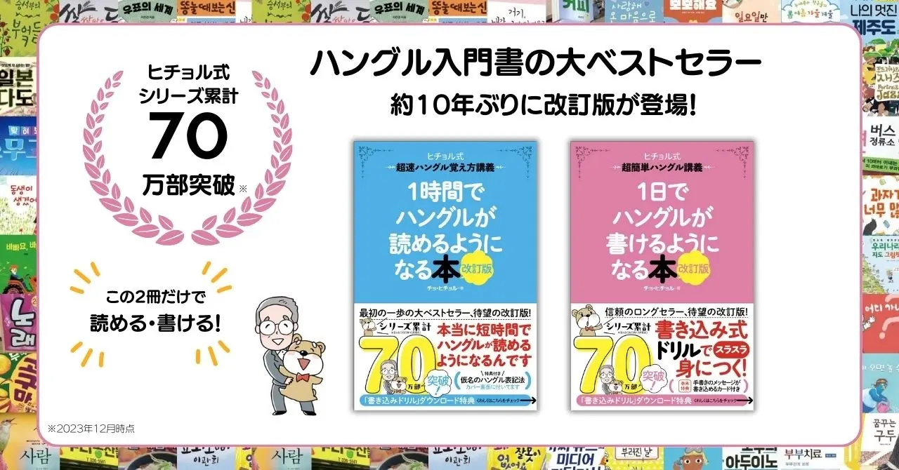 • シリーズ累計70万部突破! ハングル入門書の大ベストセラー「ヒチョル式シリーズ」がさらに読みやすくわかりやすく! 約10年ぶりの改訂版が登場 2023年12月21日 シリーズ累計70万部突破! ハングル入門書の大ベストセラー「ヒチョル式シリーズ」がさらに読みやすくわかりやすく! 約10年ぶりの改訂版が登場