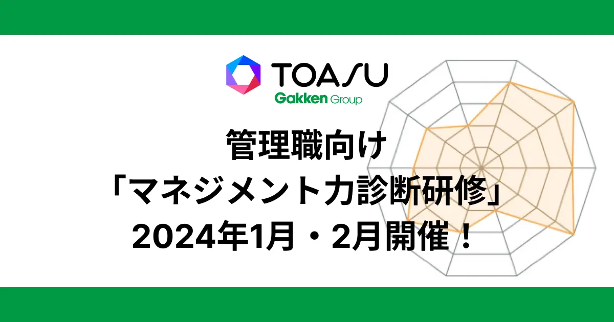• 【4つの演習でスキルを可視化】株式会社TOASUが管理職向け「マネジメント力診断研修」を2024年1月と2月に開催! 2023年12月22日 【4つの演習でスキルを可視化】株式会社TOASUが管理職向け「マネジメント力診断研修」を2024年1月と2月に開催!