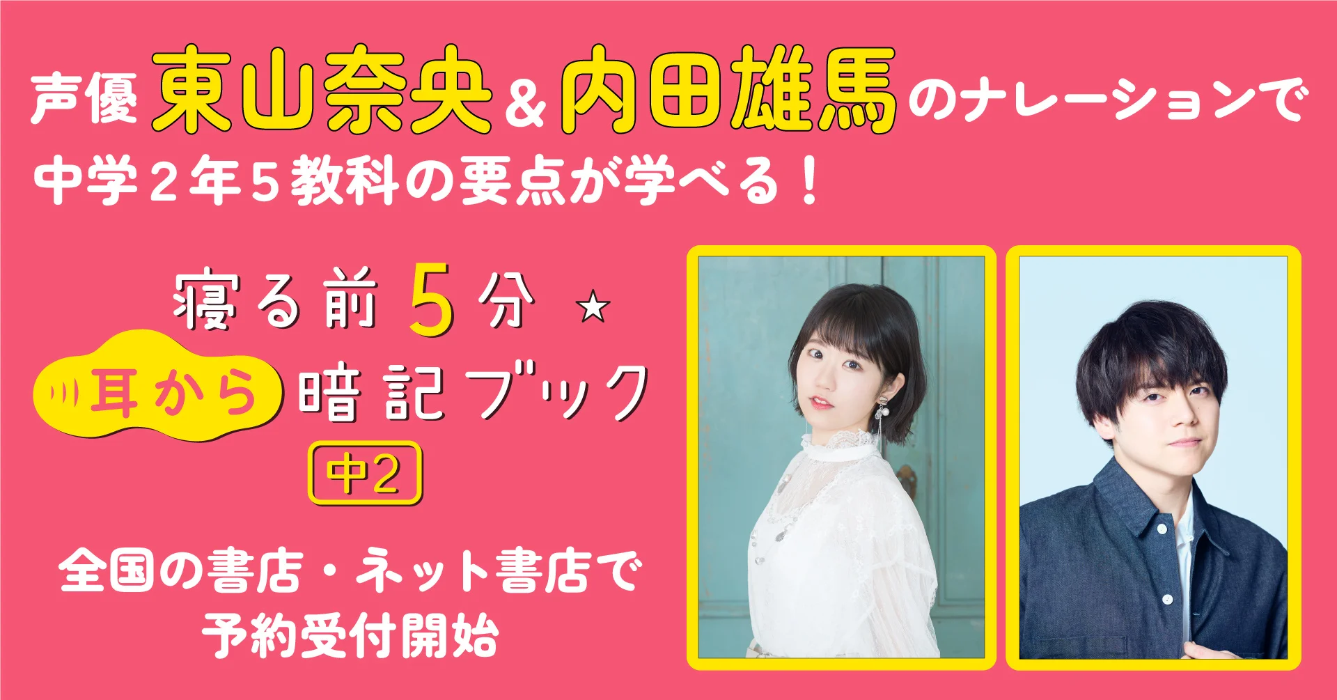 • 声優・東山奈央&内田雄馬のナレーションで中学2年5教科の要点が学べる! 耳が至福な参考書『寝る前5分耳から暗記ブック 中2』予約受付開始 2023年12月26日 声優・東山奈央&内田雄馬のナレーションで中学2年5教科の要点が学べる! 耳が至福な参考書『寝る前5分耳から暗記ブック 中2』予約受付開始