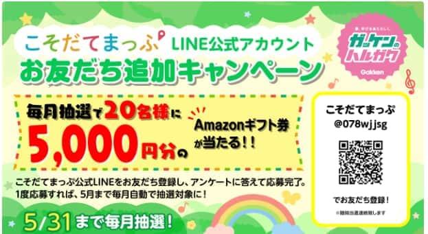 「こそだてまっぷLINE公式アカウントお友だち追加キャンペーン」はこの「ガッケンのハルガク2023」のスタートキャンペーンとして実施。お友だち追加をしてアンケートにお答えいただくと、毎月20名様に5,000円分のAmazonギフト券が当たります。