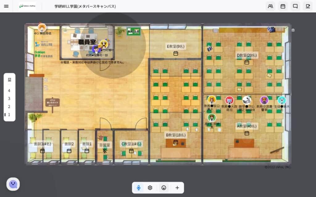 そして、生徒達からの「他生徒も参加している感じが伝わる方がやる気が出る」「一体感を得たい」といったニーズを受け、バーチャルオフィス空間「oVice」を導入しメタバースキャンパスとして運用しております。
