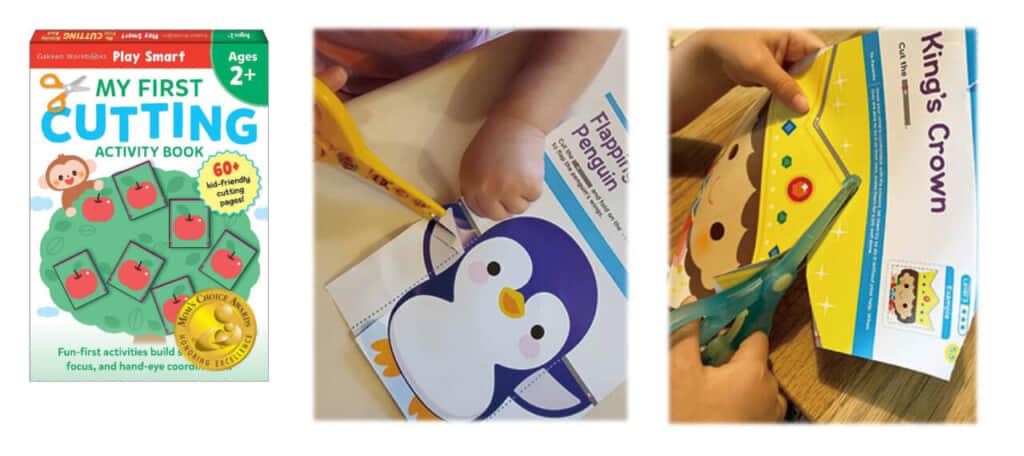 初めてはさみを使う子ども向けに、短い線から切る練習をはじめ、曲線や折れ線、工作などに発展していきます。