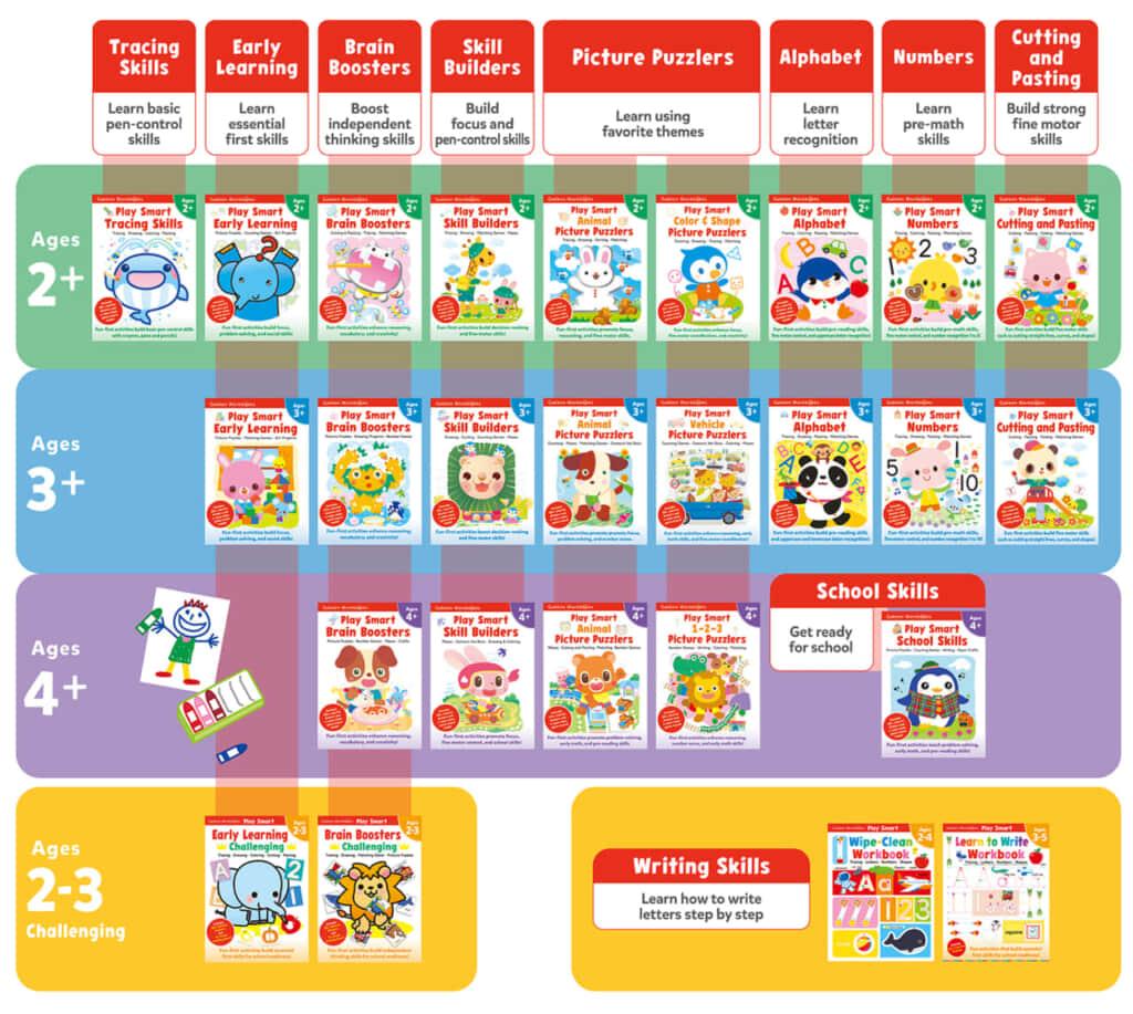 すでに26タイトルが発刊されているPlay Smart Workbook(2-4歳向け) (*1)の入門版として、少しやさしい作業内容となっています。