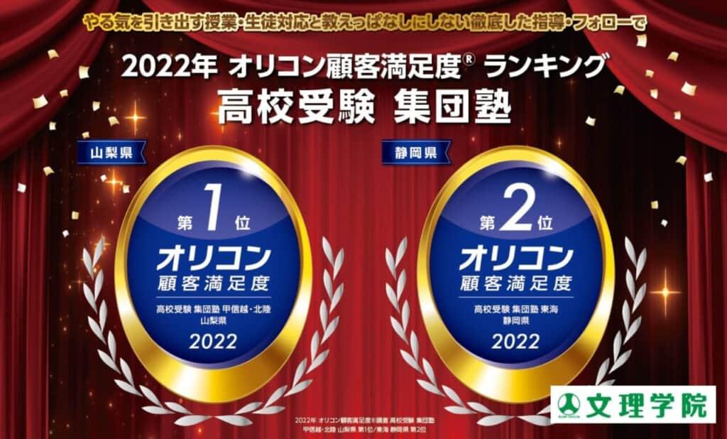 株式会社 学研ホールディングス(東京・品川/代表取締役社長:宮原博昭)のグループ会社、株式会社文理学院(山梨・都留/代表取締役社長:小倉勤)が、2022年オリコン顧客満足度(R)ランキング高校受験 集団塾 甲信越・北陸 山梨県第1位、東海 静岡県第2位を獲得しました。今回いただいた高い評価を励みに、今後も生徒・保護者様へのサービスの充実に取り組んでまいります。