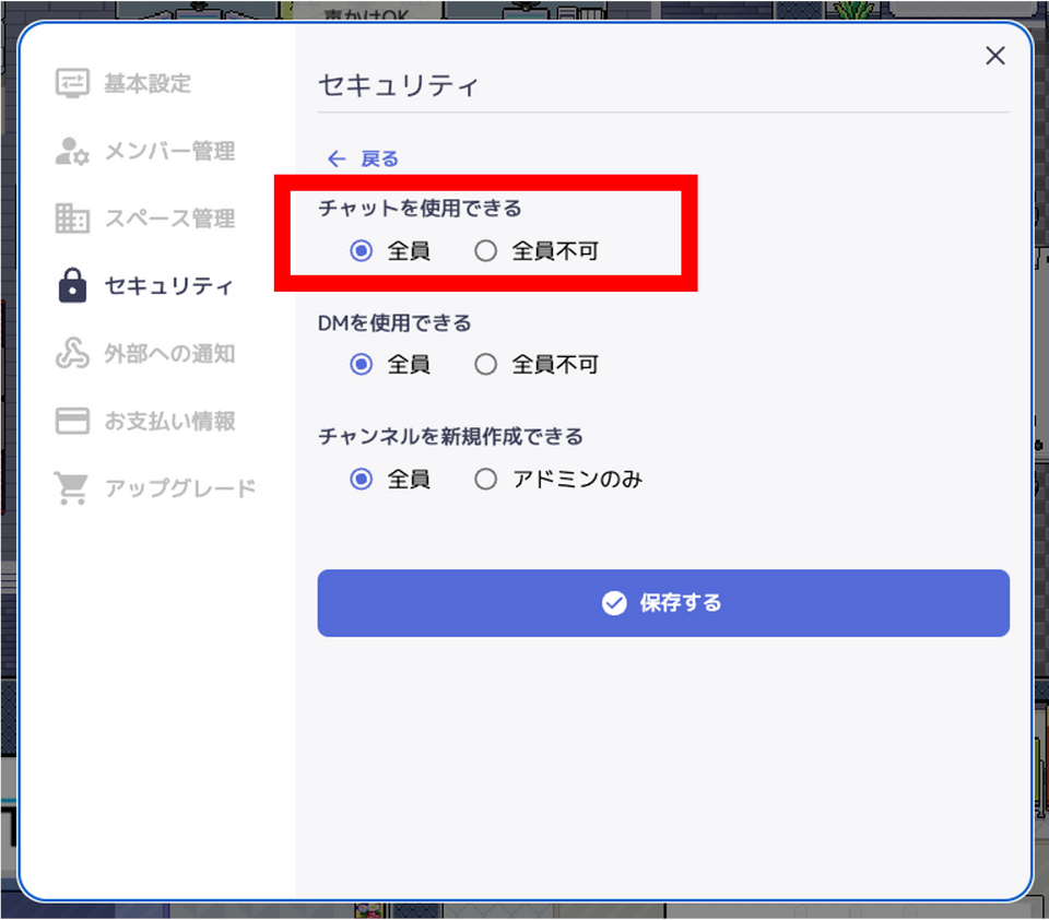 チャット機能を制限する際、「チャンネルの新規作成」「DMの利用」に加えて「チャットの利用」そのものをOFFできるようになりました。